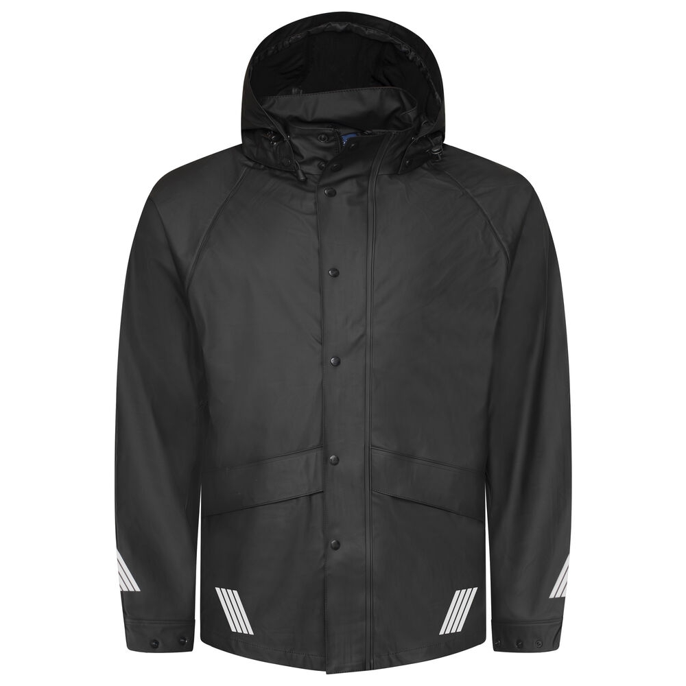 chaqueta con costuras selladas para ser resistente a agua. capucha extraíble y puños ajustables con botones a presión. bolsillos frontales con solapa. detalles reflectantes en la parte trasera, puños y cintura para una mayor visibilidad