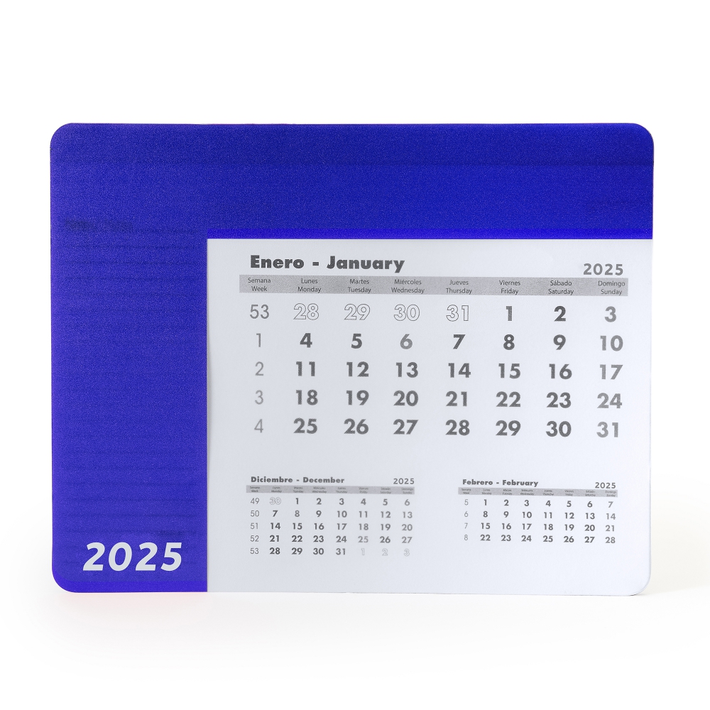 alfombrilla rectangular para ratón con calendario. cubierta de un color y transparente, tras la que se puede ver la hoja del mes correspondiente. la cubierta se levanta para acceder al calendario de 12 hojas en español e inglés, cuyas hojas se arrancan. en cada hoja mensual, aparece el mes en curso, el anterior y el posterior. base antideslizante negra. gramaje del papel 80 g/m². grosor de la cubierta 0,3 cm.consulte el precio de la alfombrilla 2025 con su comercial.