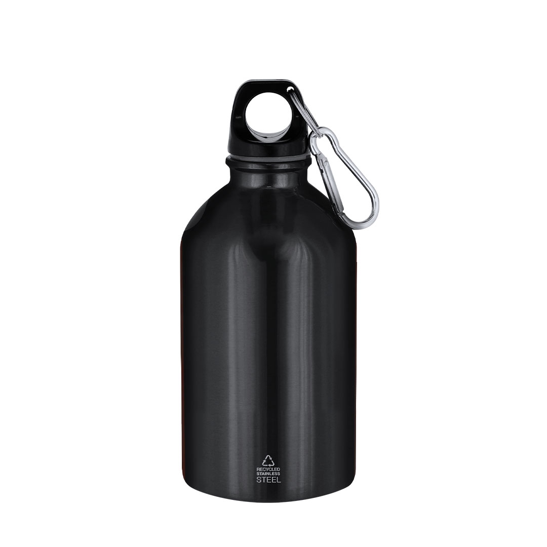 bidón con 500 ml de capacidad. fabricado en acero inoxidable reciclado con acabado metalizado. tapón negro de cierre a rosca para garantizar un sellado óptimo. incluye mosquetón metálico que facilita su transporte. con distintivo acero inoxidable reciclado.