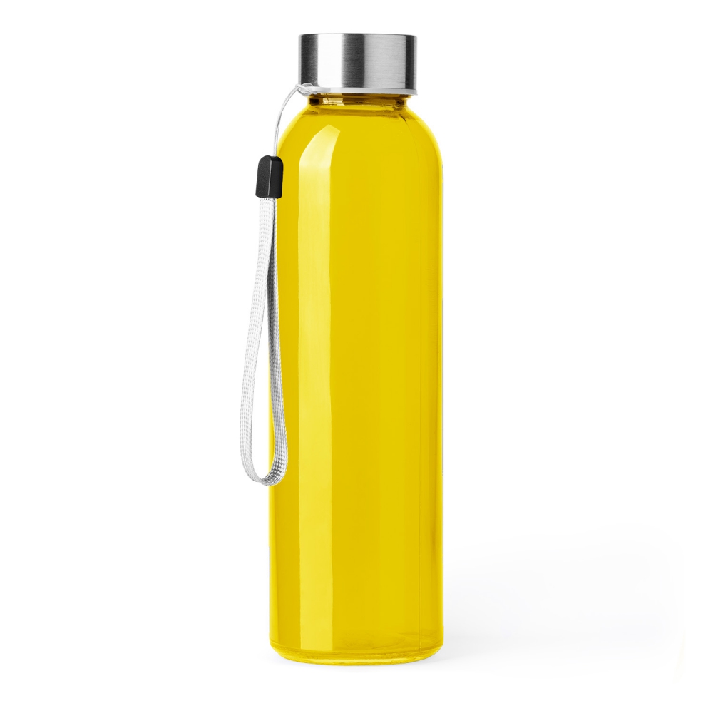 bidón con diseño de cristal con capacidad de 500ml disponible. gran variedad de colores, con tapa enroscable de acero inoxidable y de fácil transporte, gracias a su cinta, en color gris.