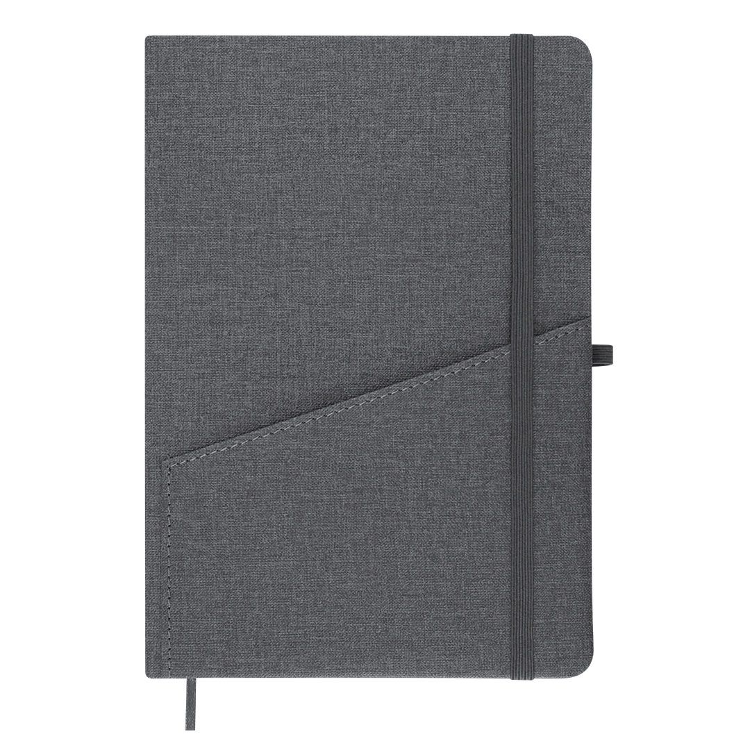 bloc de notas con cubiertas rígidas y elaborado en pu, acabado lino. con práctico bolsillo frontal, soporte para bolígrafo, marcapáginas y cinta elástica de cierre a juego. incluye 80 hojas color crema con disposición a rayas. con distintivo de pu reciclado. la pu reciclado destaca por su resistencia y elasticidad. este material reciclado y reciclable es una opción sostenible que rescata las fibras desechadas en los procesos de fabricación, minimizando así el desperdicio de material y contribuyendo a su vez a reducir el impacto ambiental, manteniendo a la vez sus propiedades originales.