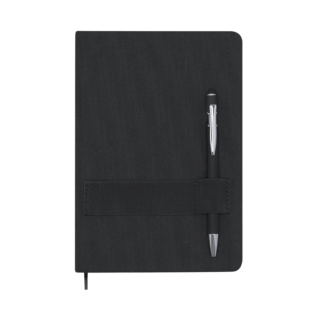 bloc de notas en tamaño a5 fabricado en elegante rpet. portadas rígidas en acabado tela. incluye banda elástica en la tapa, ideal para sujetar móvil y portabolígrafos elástico. interior con 80 páginas a disposición de una raya, marcapáginas de cinta en combinación y sobre en las contraportadas. incluye bolígrafo con tinta azul, cuerpo de aluminio acabado goma, clip metálico y tiene acción por pulsador en combinación. presenta distintivo logotipo rpet.