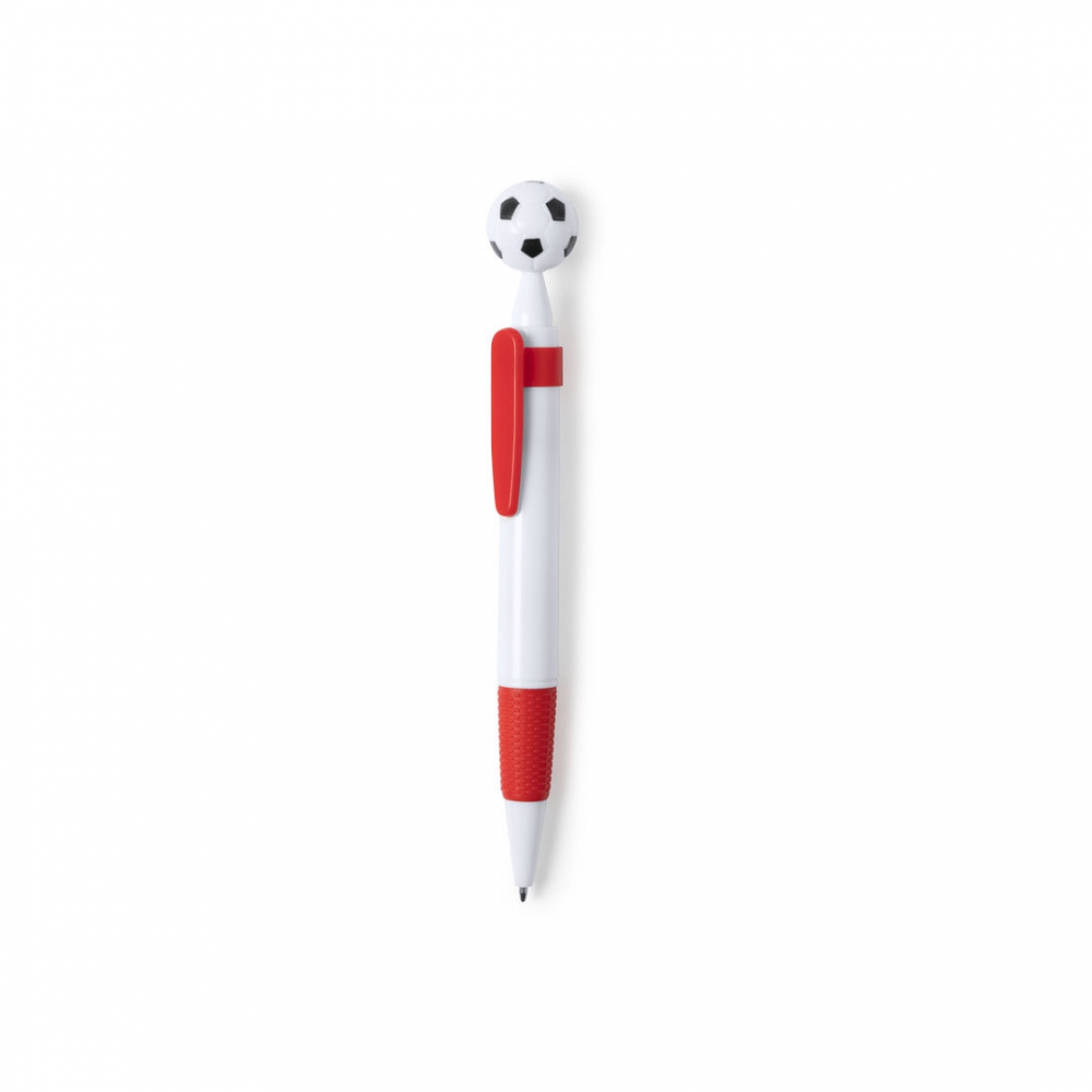bolígrafo para los más futboleros con detalle en forma de balón. de mecanismo pulsador y en desenfadado diseño bicolor. con cuerpo en color blanco, con clip y empuñadura a juego, en variada gama de colores. amplia superficie de impresión y en tinta azul.