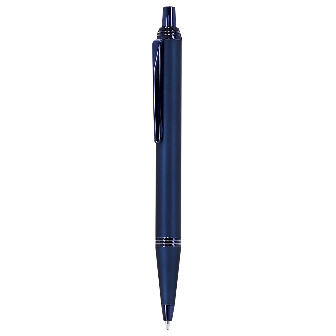 bolígrafo con cuerpo en aluminio, acabado gomoso y detalles cromados. de mecanismo pulsador, con cartucho jumbo y tinta azul.