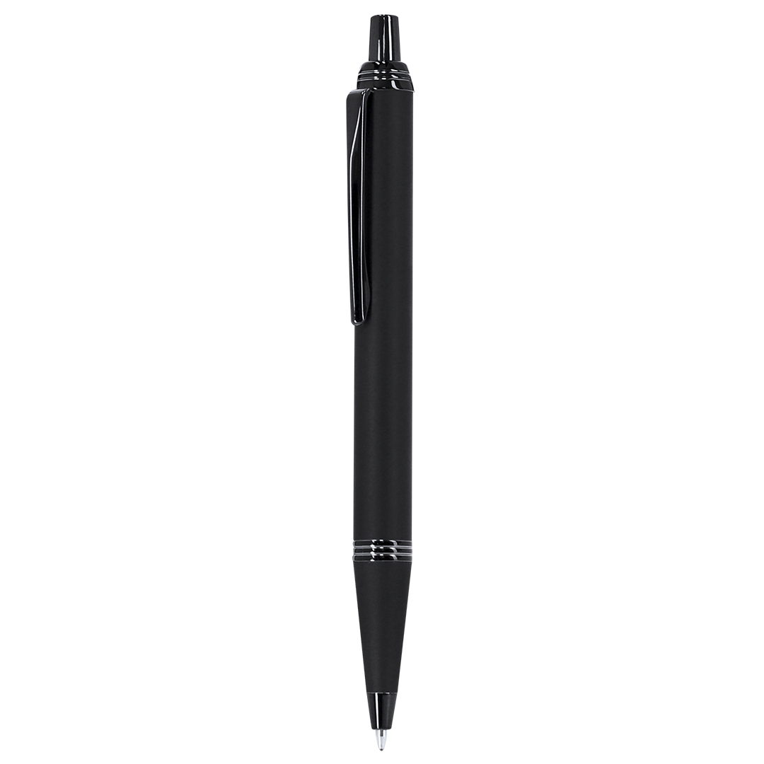 bolígrafo con cuerpo en aluminio, acabado gomoso y detalles cromados. de mecanismo pulsador, con cartucho jumbo y tinta azul.