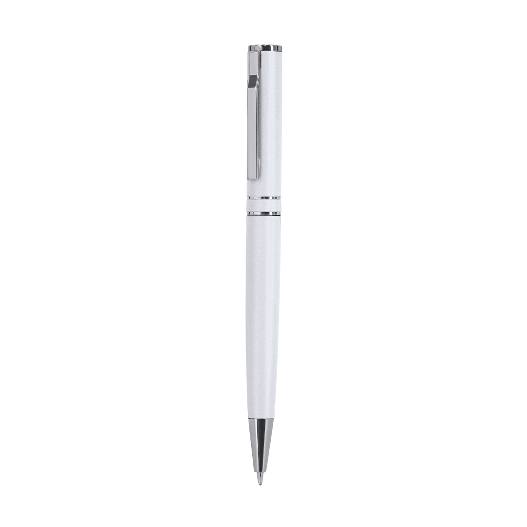 bolígrafo con mecanismo de giro, fabricado en aluminio reciclado. cuerpo con acabado mate. incluye accesorios cromados y clip a juego. carga jumbo y tinta azul. . incluye distintivo aluminio reciclado.