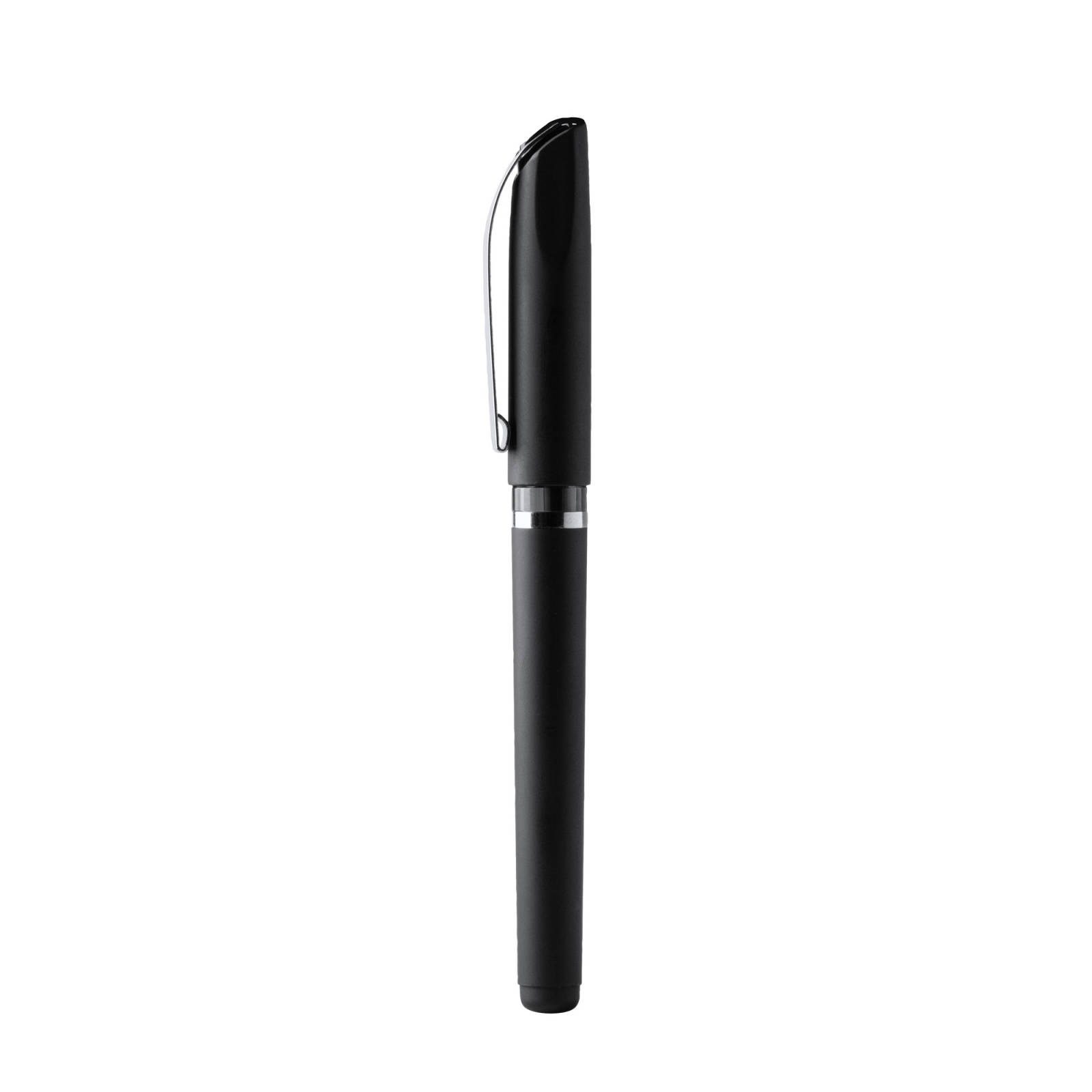 bolígrafo roller elaborado en resistente abs con tacto de goma en acabado mate. cuenta con tapa con clip y detalles metalizado. carga jumbo de tinta gel azul.