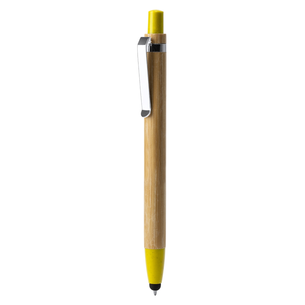 bolígrafo pulsador con cuerpo de bambú, accesorios en fibra de bambú y clip metálico. carga jumbo o carga doble. incluye puntero táctil.