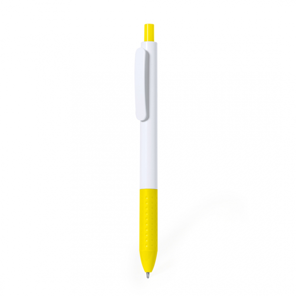 bolígrafo de mecanismo pulsador en resistente abs. fabricado en elegante combinación de caña y clip de tono blanco. con pulsador y empuñadura disponibles en una vibrante variedad de colores. en tinta azul.