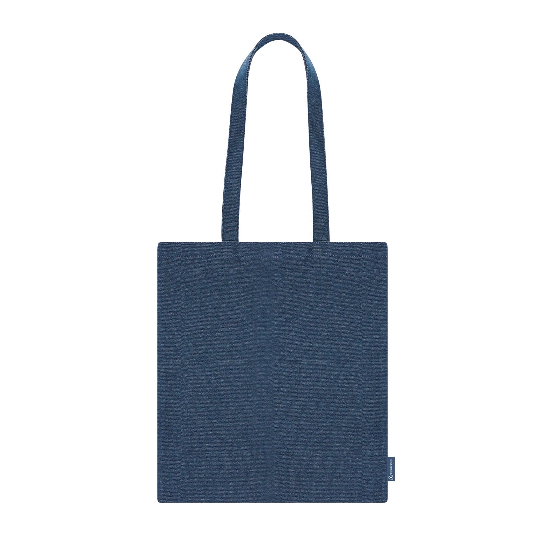bolsa confeccionada en tejido vaquero reciclado de 300 g/m2. asas largas de 70cm con refuerzo, de acabado cosido. logotipo de denim reciclado en etiqueta lateral y resistencia hasta 8 kg de peso.