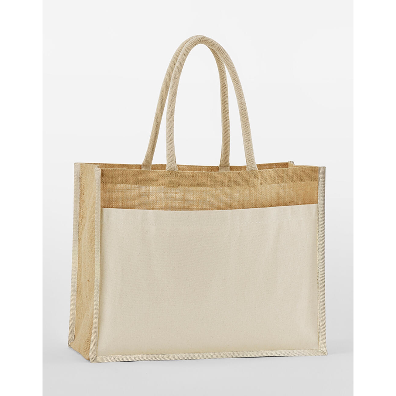 100% yute (sin laminar y almidonado). bolsillo delantero: 340 g/m², 100% algodón (lona). asas de transporte de algodón (longitud: 55cm). se puede llevar en la mano o al hombro. bolsillo frontal apto para imprimir. etiqueta extraíble para facilitar el cambio de marca. capacidad: 21 litros. dimensiones: 42x33x19cm. máx. bordado: aro de 18 tubulares. máx. área de impresión: 36x22cm.