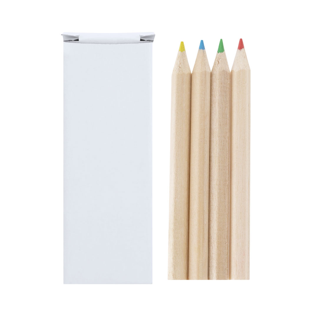 cajas de 4 lápices de madera, con cuerpo hexagonal y minas en varios colores. presentados en estuche de cartón blanco con cierre de solapa. diseñado especialmente para grabado digital.