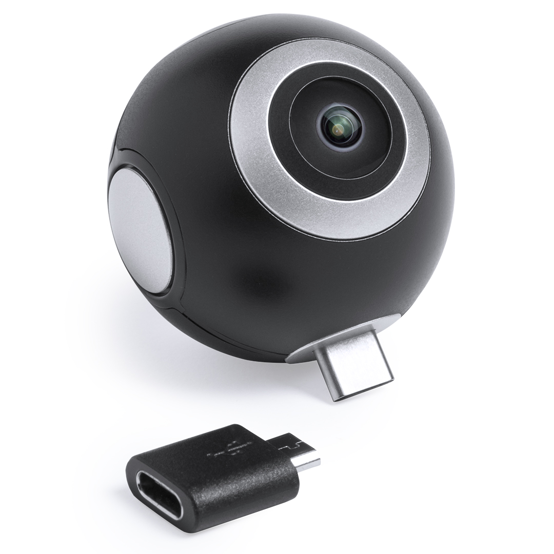 cámara 360⺠con conexión tipo c y adaptador micro usb para dispositivos móviles android. de alta calidad de captura de vídeo 360⺠con resolución hd 2048x1024p, especialmente diseñada para uso intensivo. app disponible para disfrutar de los vídeos filmados en 360⺠en gafas de realidad virtual compatibles -no incluidas-. presentada en atractiva caja de diseño.