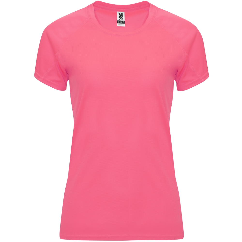 camiseta técnica entallada de manga corta ranglán para mujer, con cuello redondo y cubrecosturas a tono. paneles inferiores en mangas. remallado a tono en sisa y panel de manga. tejido control dry.