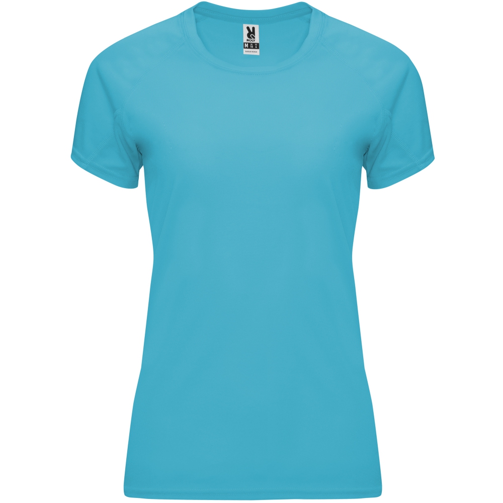 camiseta técnica entallada de manga corta ranglán para mujer, con cuello redondo y cubrecosturas a tono. paneles inferiores en mangas. remallado a tono en sisa y panel de manga. tejido control dry.