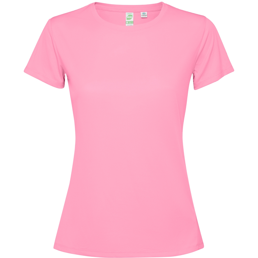 camiseta técnica entallada de manga corta para mujer. cuello con cubrecosturas a tono. bajo espalda ligeramente mas largo que el delantero. costuras laterales desplazadas hacia delante.