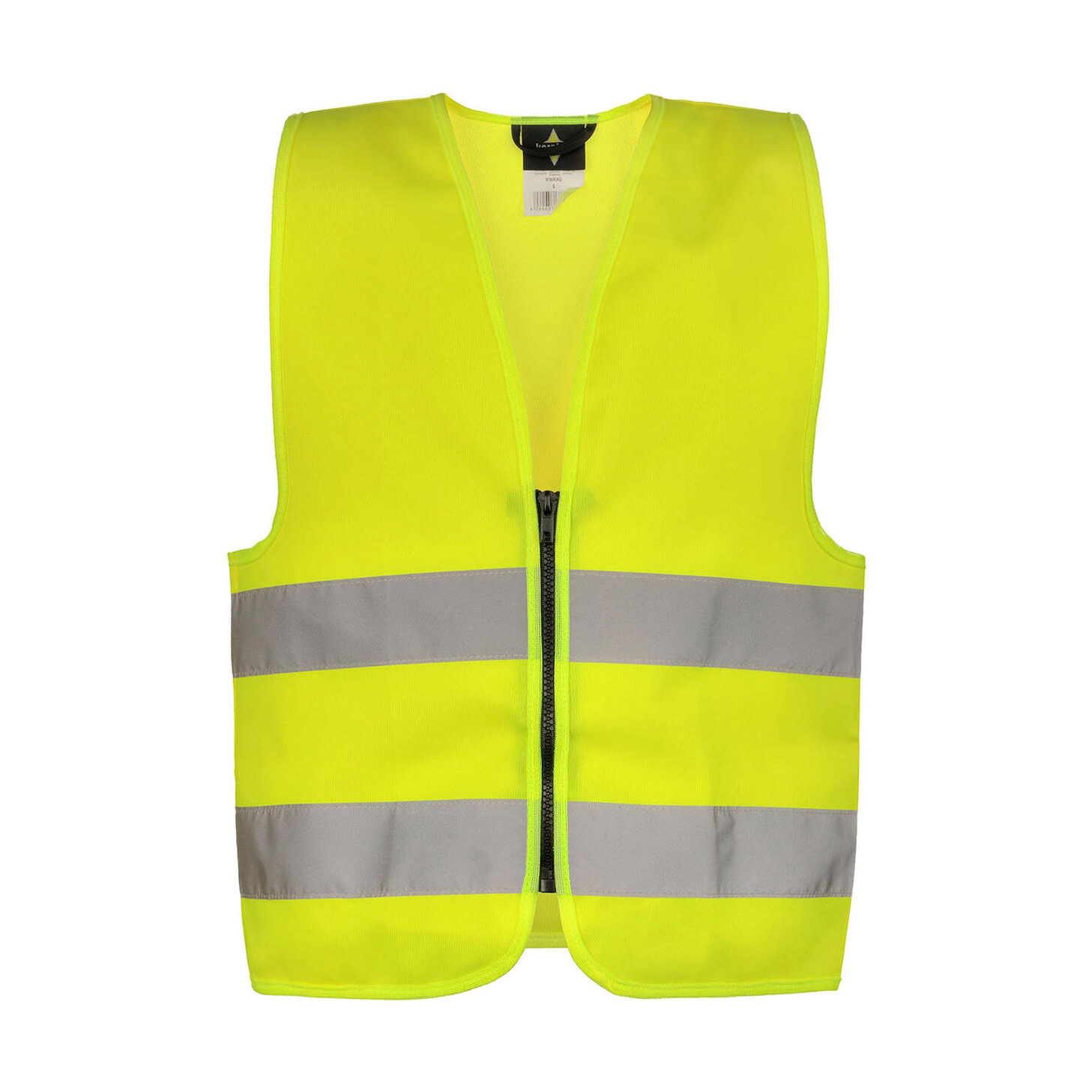 100% poliéster. cremallera completa en la parte delantera. rayas horizontales reflectantes (5 cm de ancho) en la parte delantera y trasera. en 17353:2020. embalado individualmente en bolsa de plástico.