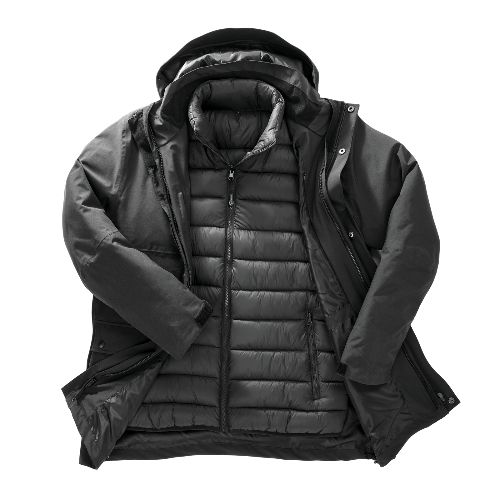 tejido exterior confeccionado en poliéster ripstop reciclado con membrana de tpu y forro confeccionado en 100 % poliéster reciclado. relleno de la chaqueta acolchada: 280 g/m² de plumón sintético reciclado. impermeabilidad 3000 mm y transpirabilidad 1000 mvp. cazadora técnica 3 en 1 compuesta por chaqueta impermeable y chaqueta acolchada interior desmontable, que pueden usarse juntas o por separado según las condiciones. chaqueta exterior: capucha desmontable y ajustable, cierres con cremallera impermeables, bolsillos múltiples, ventilaciones en las axilas, mangas ajustables, costuras termoselladas. chaqueta acolchada: cierre con cremallera, bajos y puños elásticos, tejido suave y ligero. chaqueta técnica 3 en 1 compuesta por una chaqueta impermeable y una chaqueta acolchada interior extraíble.chaqueta acolchada.