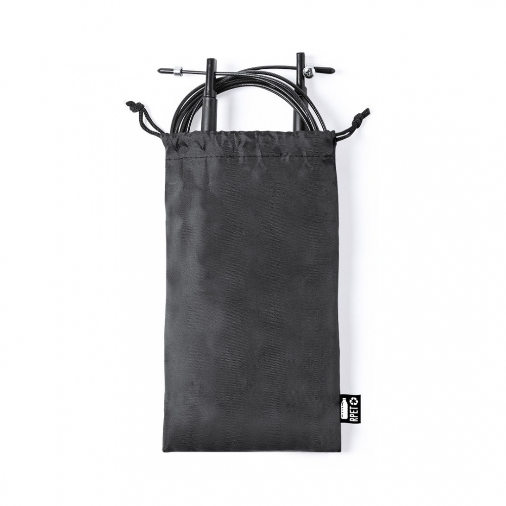 comba de calidad premium, con cuerda extra larga ajustable de 3m de largo y fabricada en acero con cobertura de resistente pvc. con mangos de sujeción ergonómicos y presentada en funda de poliéster rpet con cierre de cordón, elaborada a partir de plástico reciclado para así fomentar la reutilización de residuos plásticos y contribuir a la sostenibilidad del planeta. etiqueta distintiva rpet en la funda.