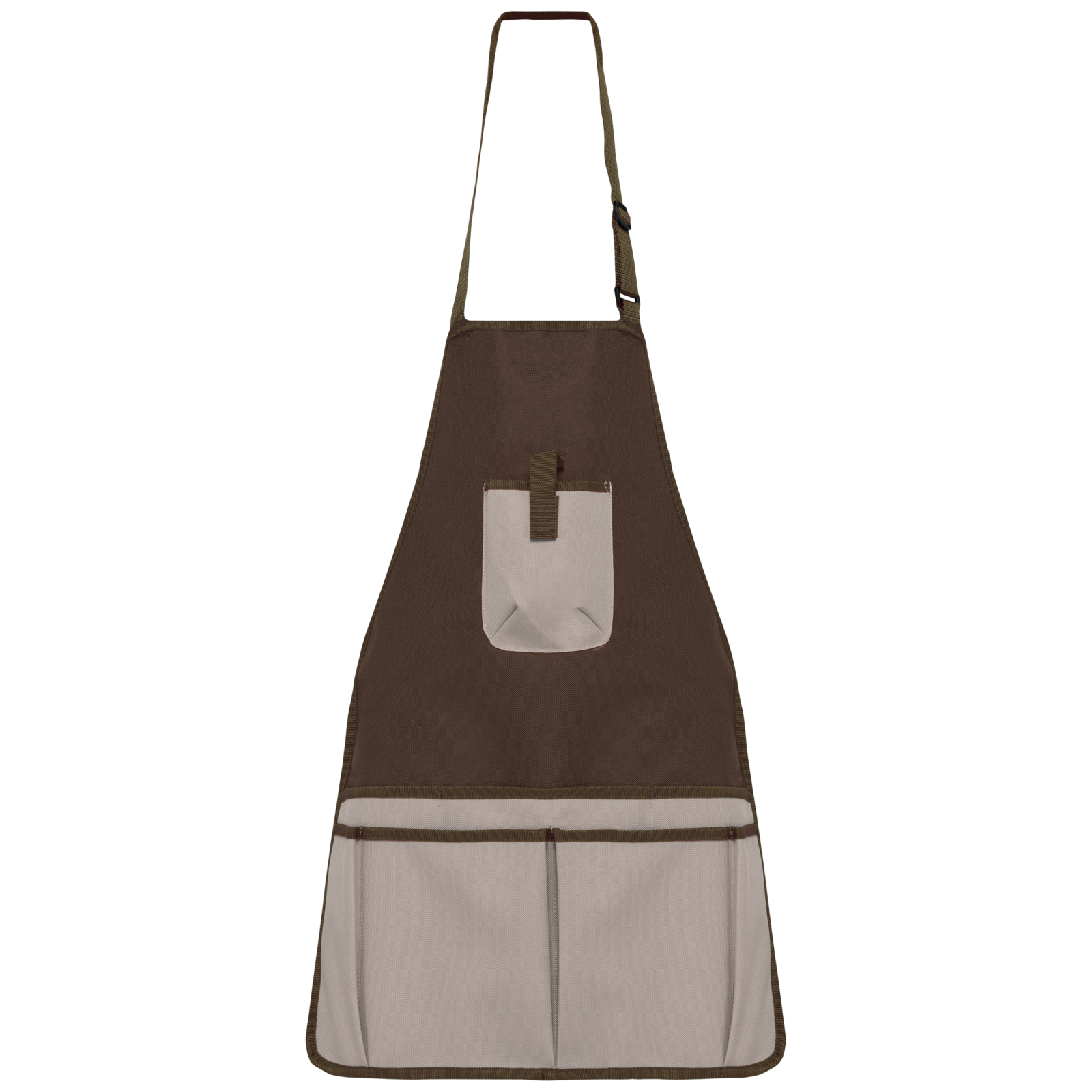 100% poliéster reciclado. tejido oxford revestido e impermeable a 4000 mm. 7 bolsillos abiertos en 2 niveles con acabado en bies a contraste. 1 bolsillo a la altura del pecho con cierre mediante tira de velcro. tira y hebilla de ajuste de plástico reciclado a la altura del cuello y de la cintura para ajustar la talla del delantal. alto total = 60 cm. ancho total en la parte baja = 46 cm material impermeable de alta calidad. material respetuoso con el medio ambiente.delantal corto.