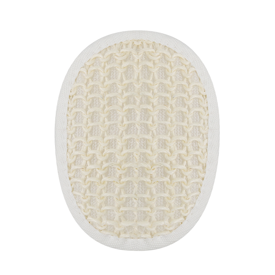 esponja exfoliante de baño en algodón adaptable a la palma de la mano, con cinta de sujeción a juego.