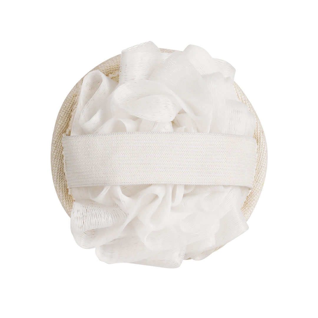 esponja exfoliante 2 en 1 en fibra de pe. por un lado, suave esponja y por otro lado esponja exfoliante con cinta de sujeción adaptable a la palma de la mano.