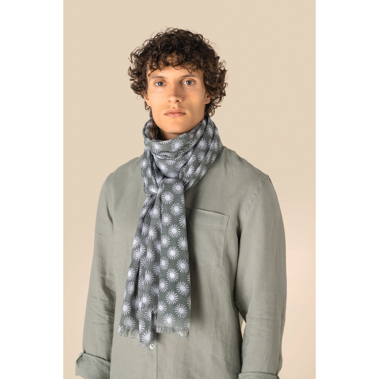 100% algodón. fular tejido con flecos y decorado con un estampado de motivos blancos tipo sol sobre fondo caqui. al estar tejidos de forma artesanal, nuestros fulares pueden presentar ligeras variaciones de color entre una pieza y otra, lo que demuestra la autenticidad de su elaboración. tejido de algodón con acabados de flecos. estampados con efecto de rayos de sol para un estilo gráfico y veraniego.bufanda, pañuelo, fular chech.
