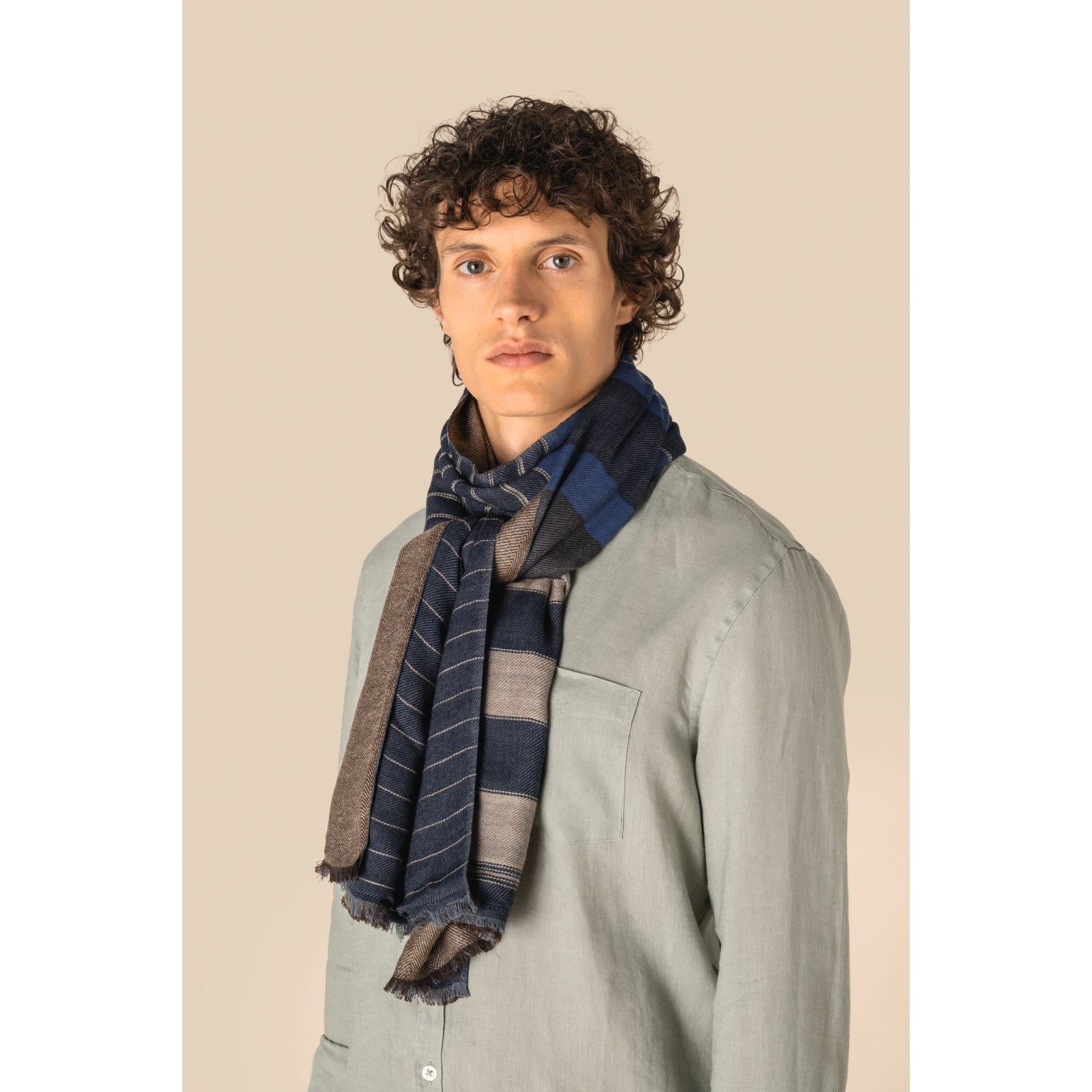 50% algodón, 50% viscosa. fular en tejido de sarga con flecos. diseño reversible de doble cara: un lado con patrón de espiga y el otro con rayas contrastadas en tonos beige, azul y marrón. al estar tejidos de forma artesanal, nuestros fulares pueden presentar ligeras variaciones de color entre una pieza y otra, lo que demuestra la autenticidad de su elaboración. fular reversible dos en uno tejido de sarga con diseño de espiga y rayas contrastadas.bufanda, pañuelo, fular chech.
