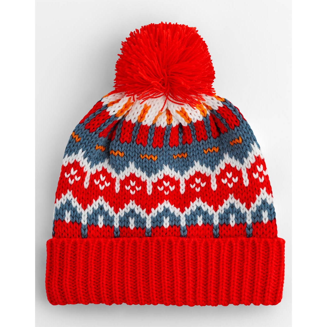 56 % poliéster reciclado, 44 % acrílico ·forro polar integral de poliéster reciclado ·patrón fair isle atemporal ·estilo clásico ·pompón del mismo color ·diseño con vuelta para una personalización óptima ·etiqueta extraíble para facilitar el cambio de marca..