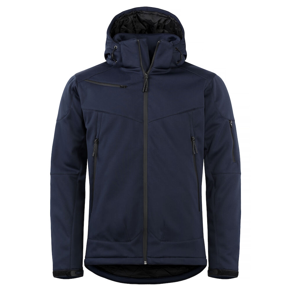 chaqueta softshell técnica acolchada. capucha desmontable y ajustable. mangas precurvadas para facilitar el movimiento. cuatro bolsillos exteriores con cremalleras impermeables y dos bolsillos interiores uno con cremallera y otro de malla. puños ajustables con velcro, ribete reflectante en espalda. forro con cremallera oculta para facilitar el marcaje.