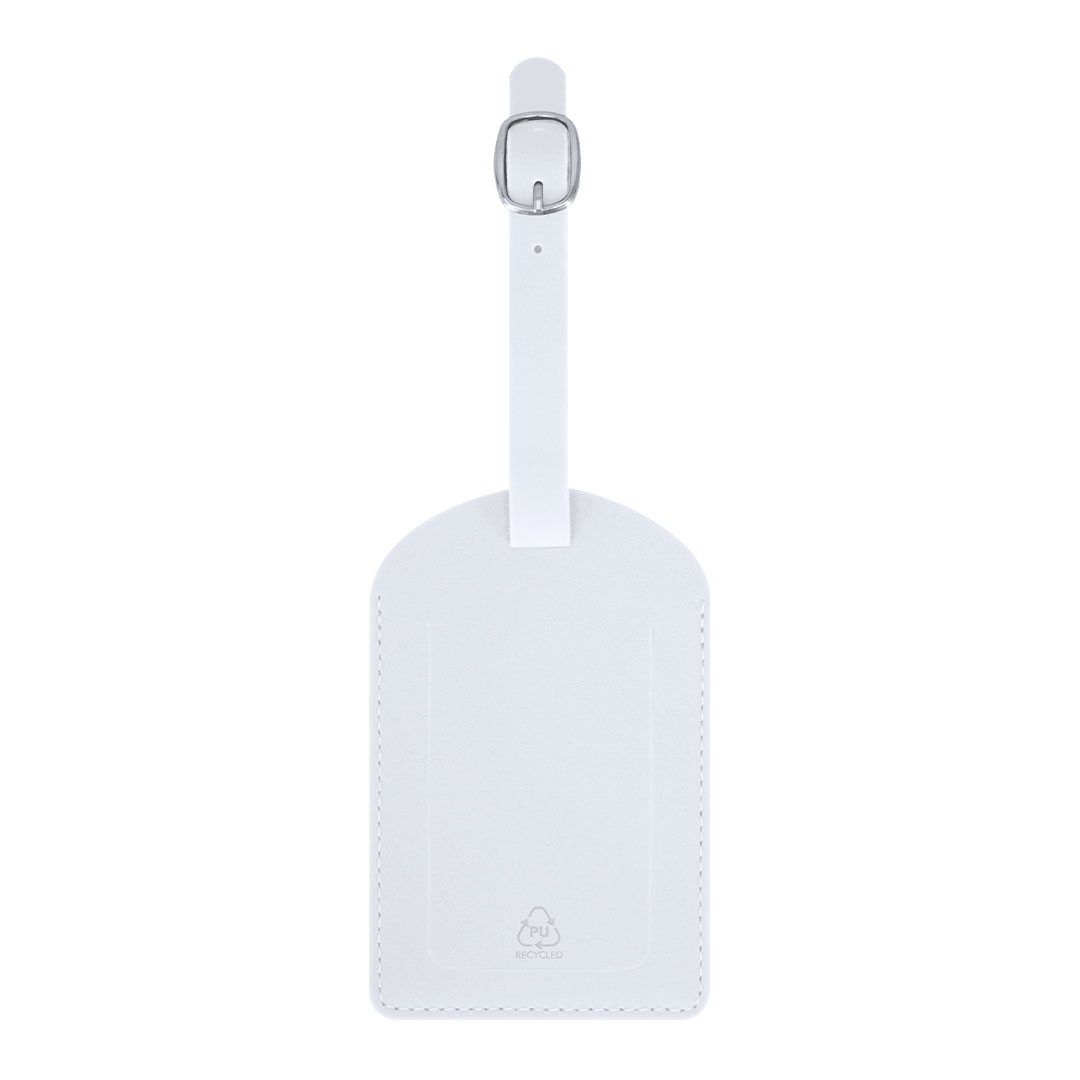 identificador para maletas fabricado en pu reciclado. para enganchar a cualquier maleta gracias a su hebilla ajustable. con ventana y etiqueta distintiva de pu reciclado.