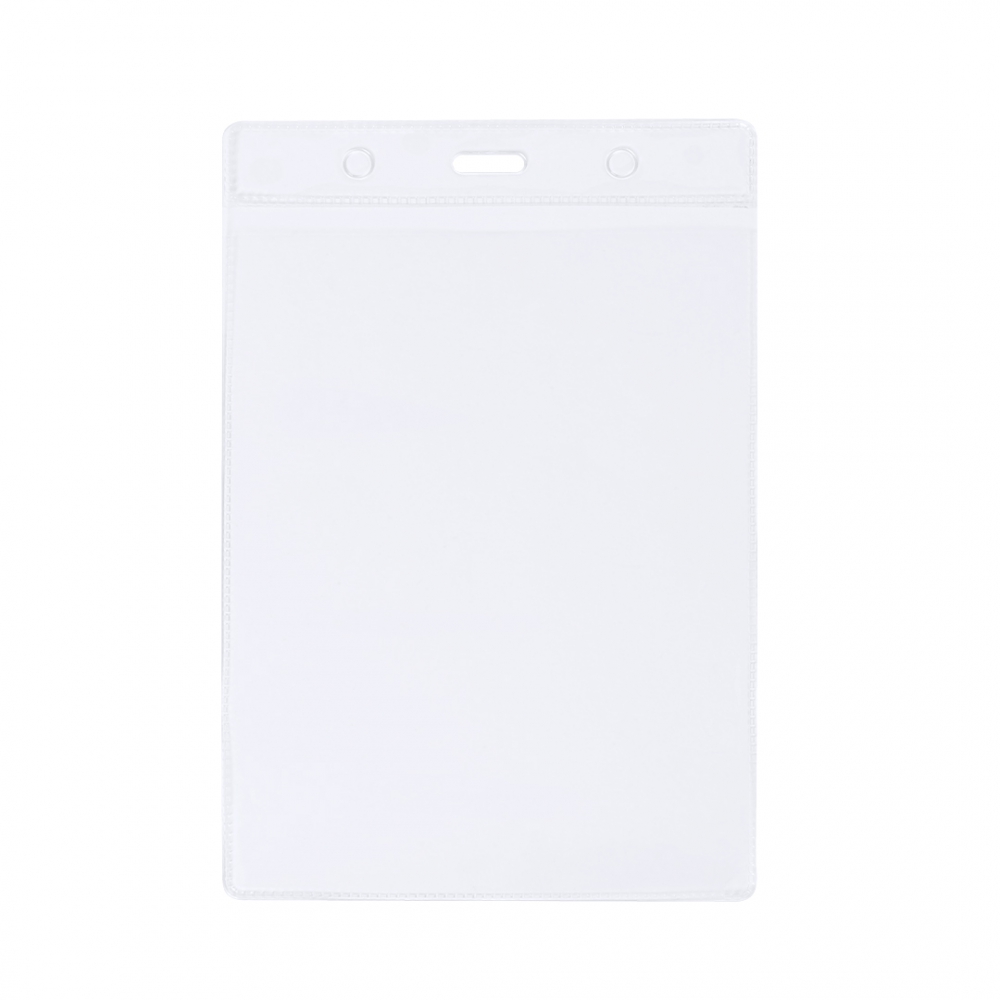 identificador vertical de pvc. práctico porta acreditaciones con parte superior reforzada y perforaciones tanto para la sujeción central como en los laterales.