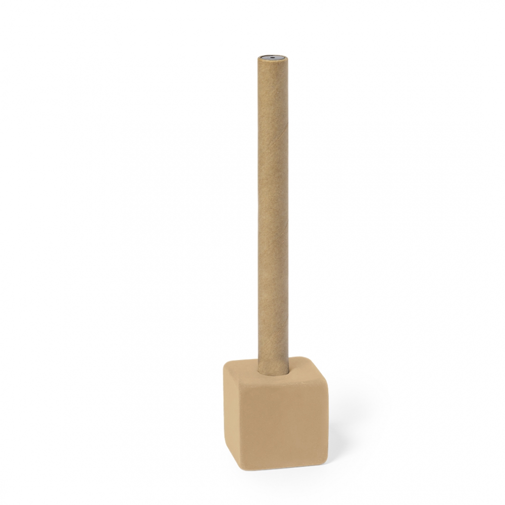 lápiz eterno fabricado en cartón reciclado con soporte incluido. práctico instrumento de escritura infinita gracias a su punta que no se desgasta. con práctica goma de borrar en forma de cubo. set diseñado en color natural y negro. presentado individualmente en una caja kraft.