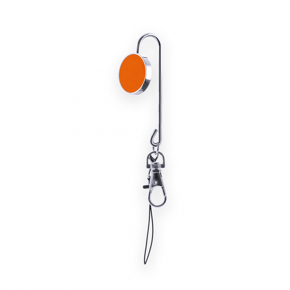 llavero cuelgabolsos metálico con corona en polipiel de vivos colores. con cinta de transporte de cierre de mosquetón. presentado en estuche individual.