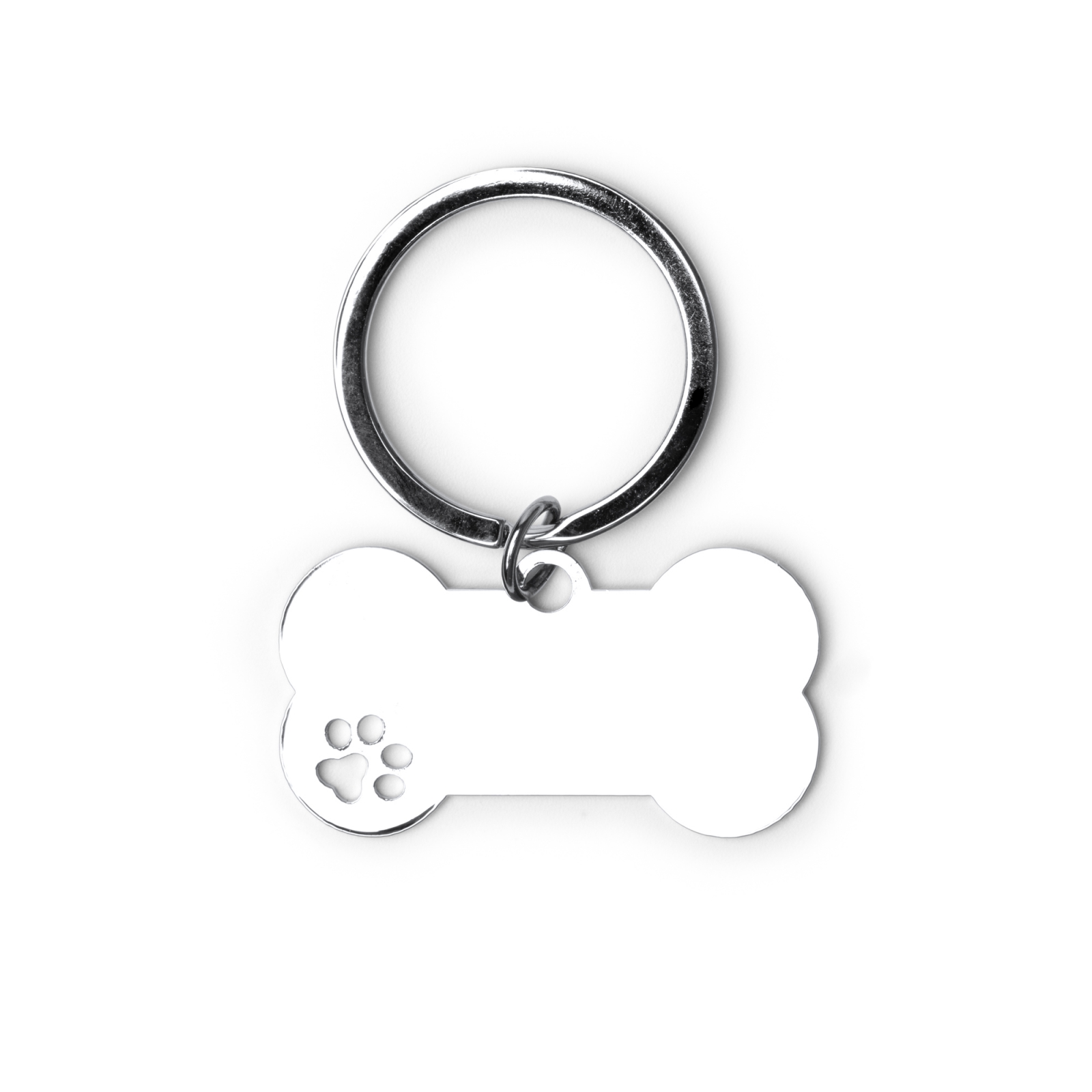 llavero de metal 201 con diseño en forma de hueso. cuenta con un detalle en el lateral en forma de huella.
