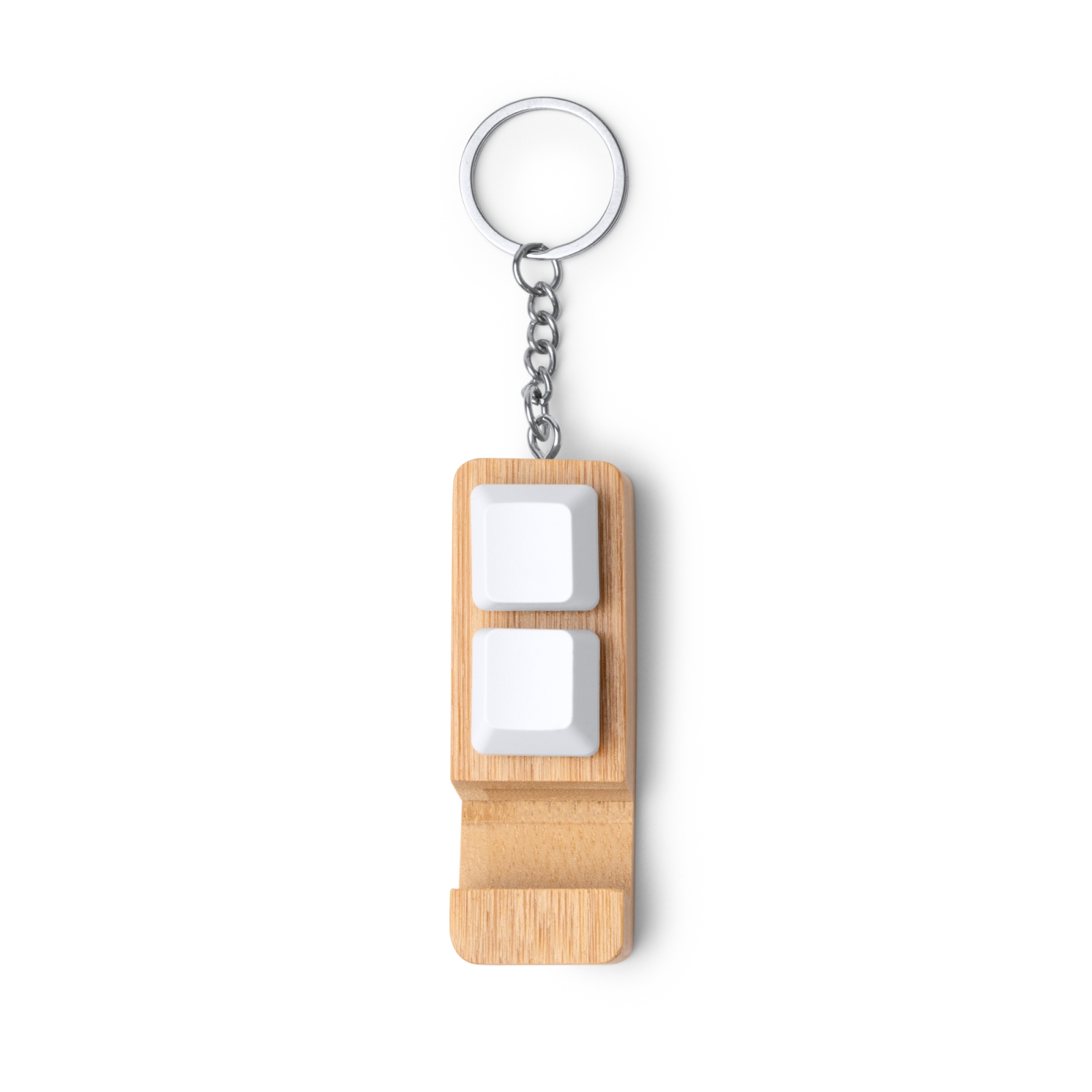 llavero elaborado en bambú con soporte para smartphone y función antiestrés. su diseño cuenta con botones tipo teclado en blanco que pueden pulsarse y utilizarse como medio antiestrés.