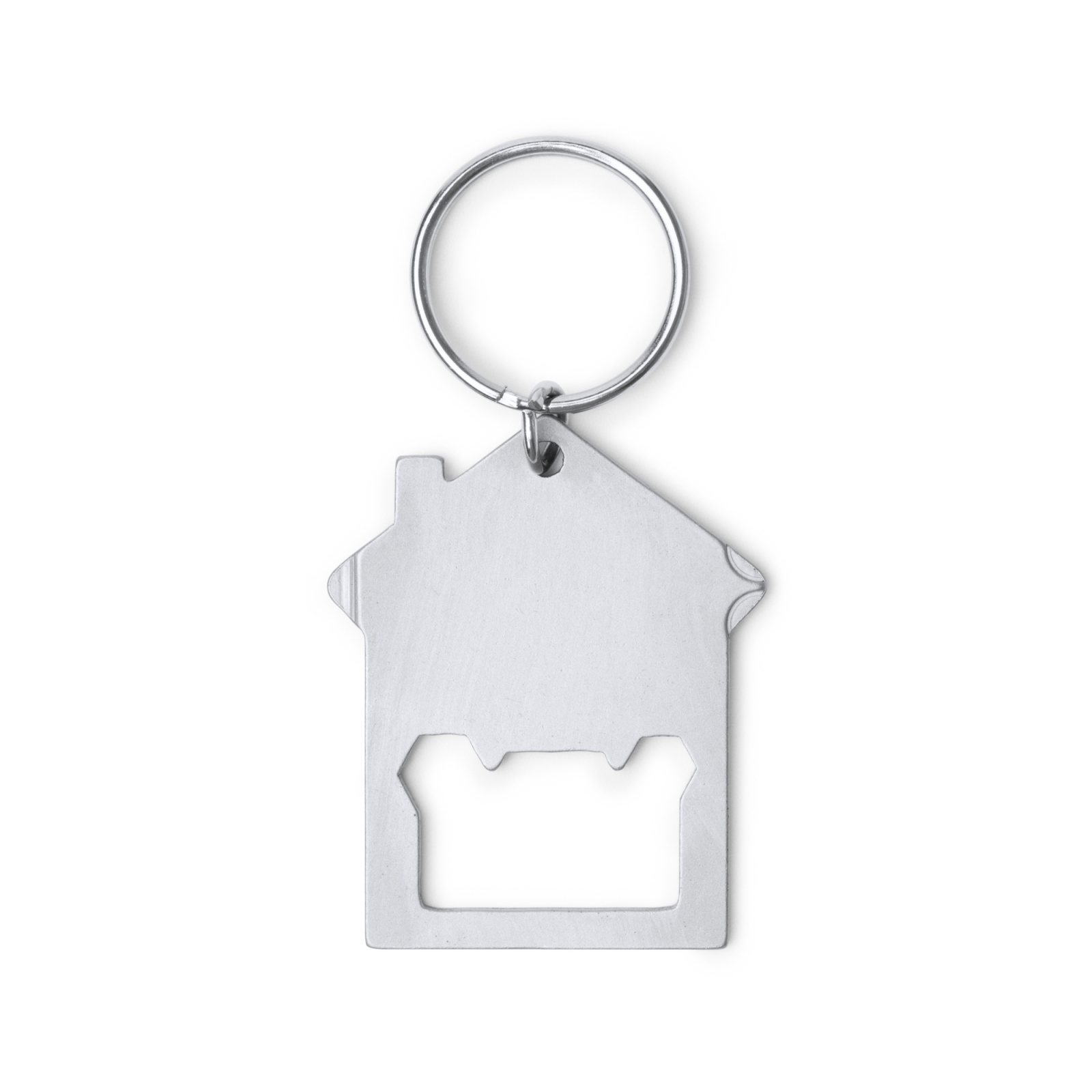 llavero multiherramienta elaborado en acero inoxidable con diseño en forma de casa. cuenta con funciones abridor, destornillador de estrella y plano en sus laterales, llave allen de tamaños m3 y m4 en los laterales de su abertura central.