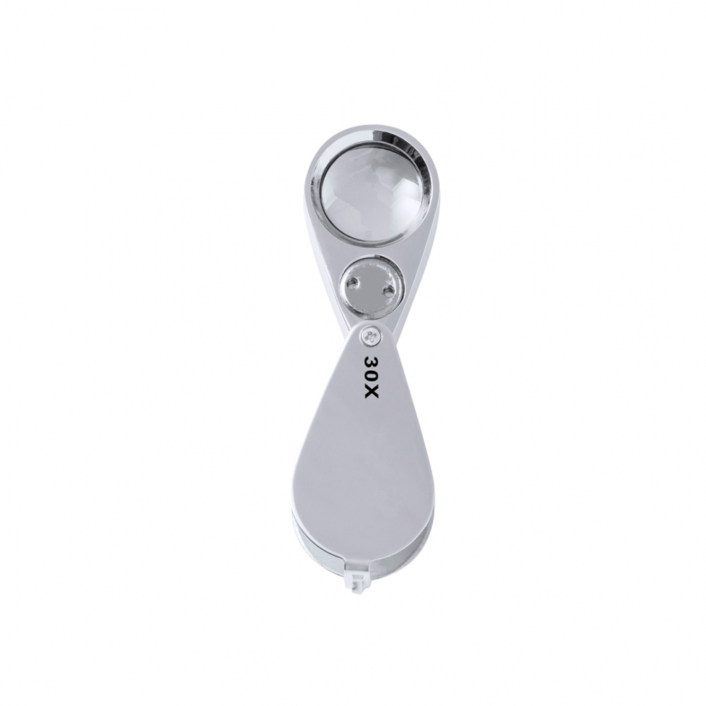lupa plegable con aumento 30x fabricada en resistente metal. con luces led integradas y gran potencia de aumento para obtener una visión muy cercana de los detalles más pequeños, con ampliación sin distorsión. ideal para inspeccionar objetos de tamaño reducido, textos, etc. además, tiene un accesorio para colgar, y viene dentro de un estuche con interior acolchado para una mayor protección. alimentación a pilas (de botón incluidas), con llave especial para reemplazarlas cuando se agoten. presentada en caja de cartón negra.