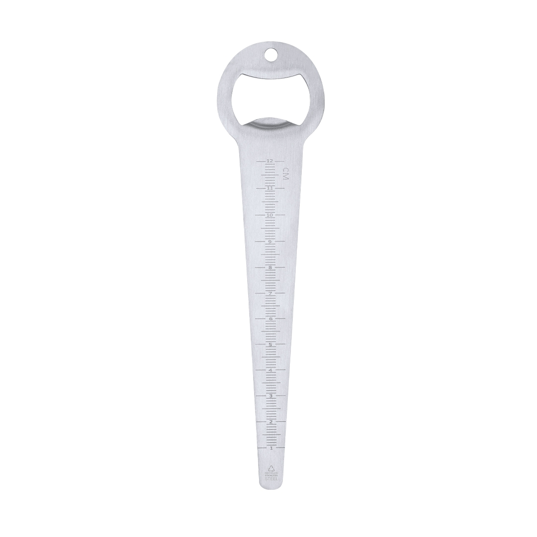 medidor de profundidad de semillas con abridor realizado en acero inox reciclado. medidor en regla horizontal con escalas en milímetros y centímetros, de 1 a 12, con comienzo a 1.2 cm desde la base. con distintivo acero inoxidable reciclado.