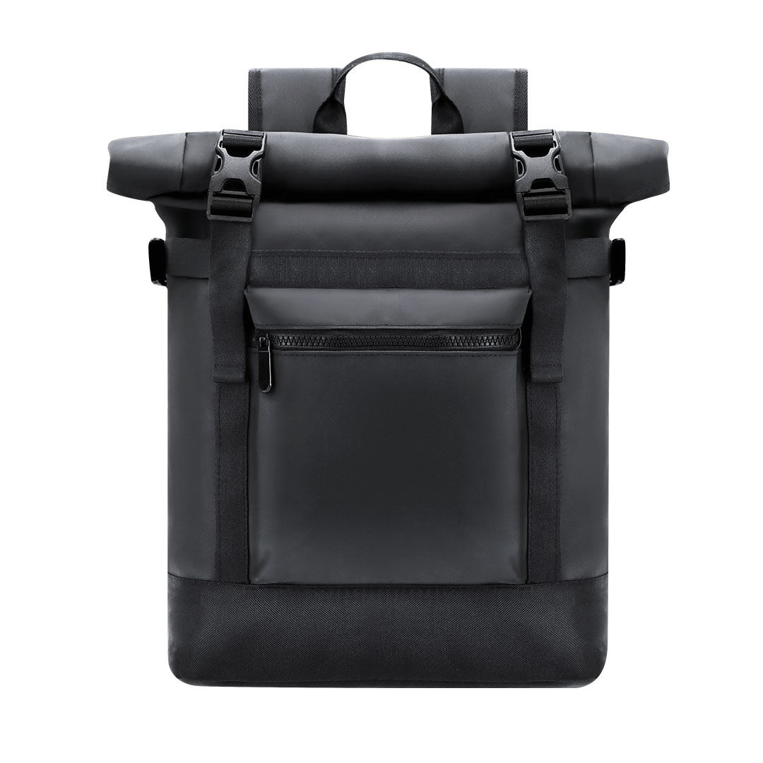 mochila confeccionada en suave pvc con sistema de cierre enrollable y hebillas. dispone de un bolsillo con cremallera. interior de gran capacidad con compartimento acolchado para portátil de hasta 15 pulgadas y tablet de 10”. cintas laterales ajustables que permiten compactar el volumen según necesidad. cintas de hombros en pu y espalda acolchadas para mayor comodidad. incluye cinta trasera para ajuste en trolley o maleta, ideal para viajes y desplazamientos.