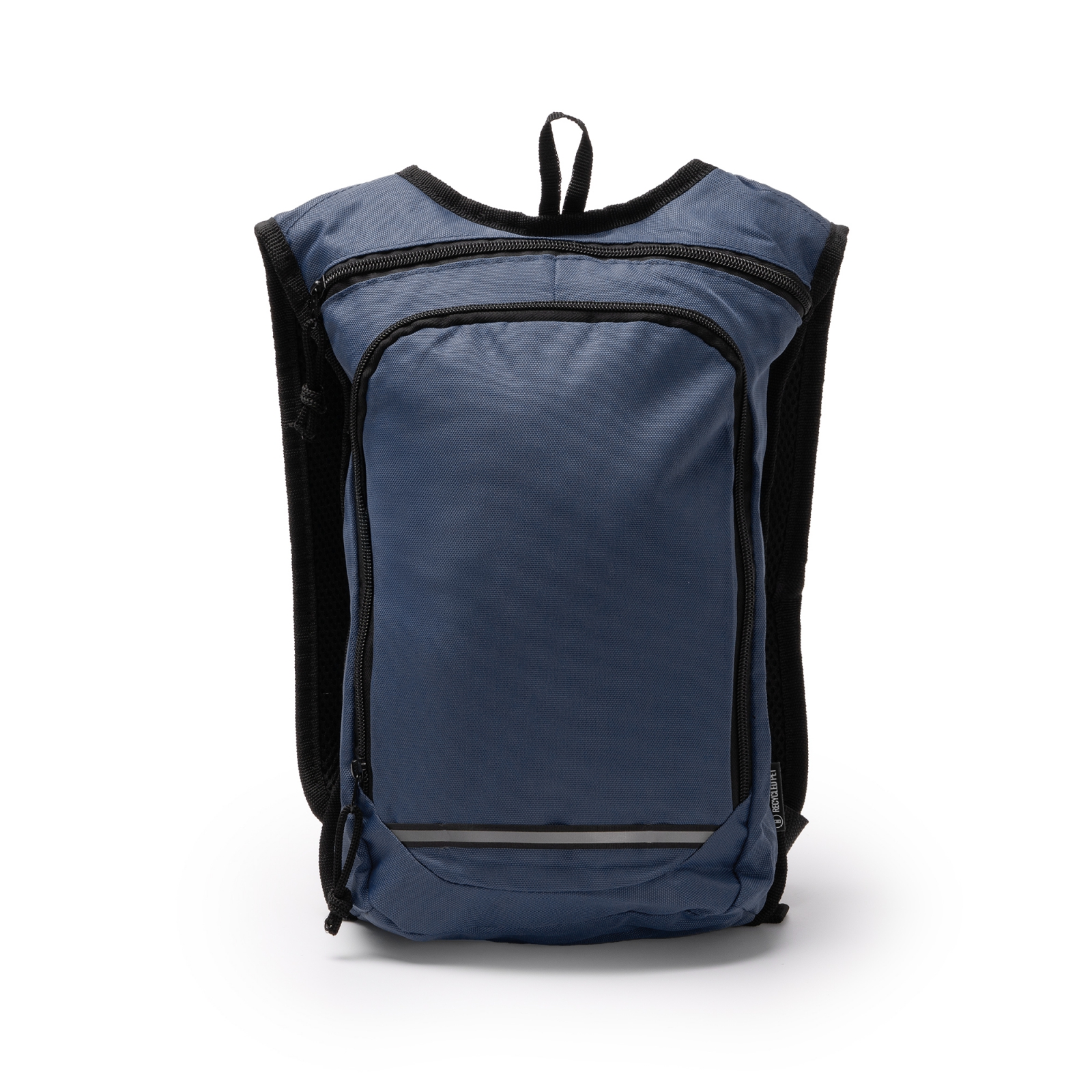 mochila elaborada en rpet 600d. cuenta con un compartimento principal con cierre de cremallera en su parte superior, junto a dos aperturas para mangueras de bebidas. incluye un compartimento frontal exterior de gran amplitud con cierre de cremallera. ambas cremalleras cuentan con un tirador en negro. cuenta con una banda reflectante en horizontal en su parte frontal que mejora la visibilidad. asas y espalda acolchadas.