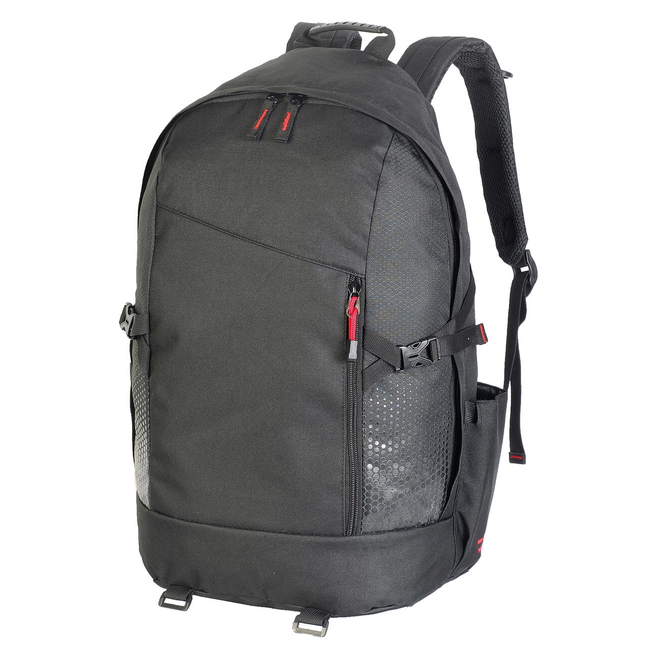 100% poliéster (600d ripstop). asa de mano. correas de hombro acolchadas ajustables. correas de compresion. compartimento principal con cremallera y otro pequeño en el frente. dos amplios bolsillos laterales. capacidad: 35 litros. medidas: 30 x 54 x 22 cm. adecuado para serigrafía,transfer y bordado. max. bordado: 6, 12 aro plano. max. área de impresión: 12 x 7 cm (lados), 10 x 15 cm (frente).