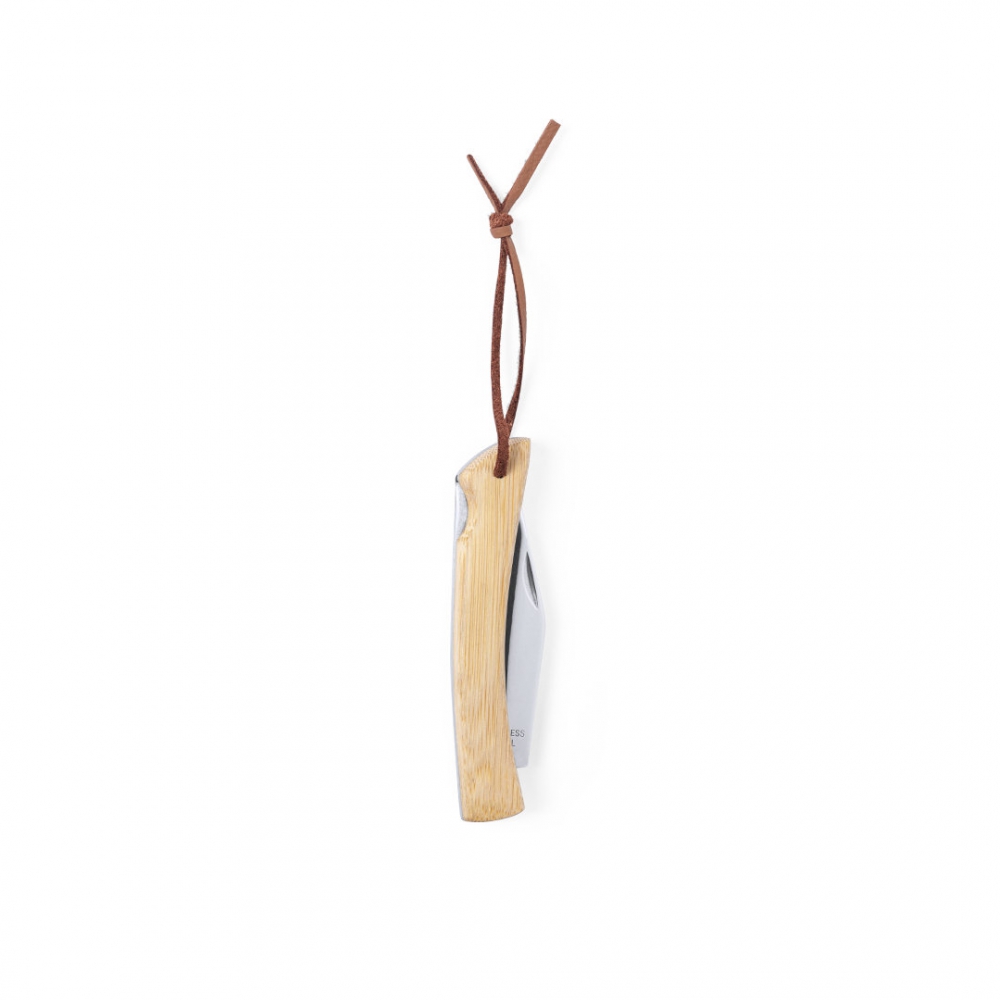 navaja de línea nature con hoja de acero inox y resistente empuñadura de bambú con bloqueo de seguridad. con cinta para transporte en polipiel y presentada en caja individual.