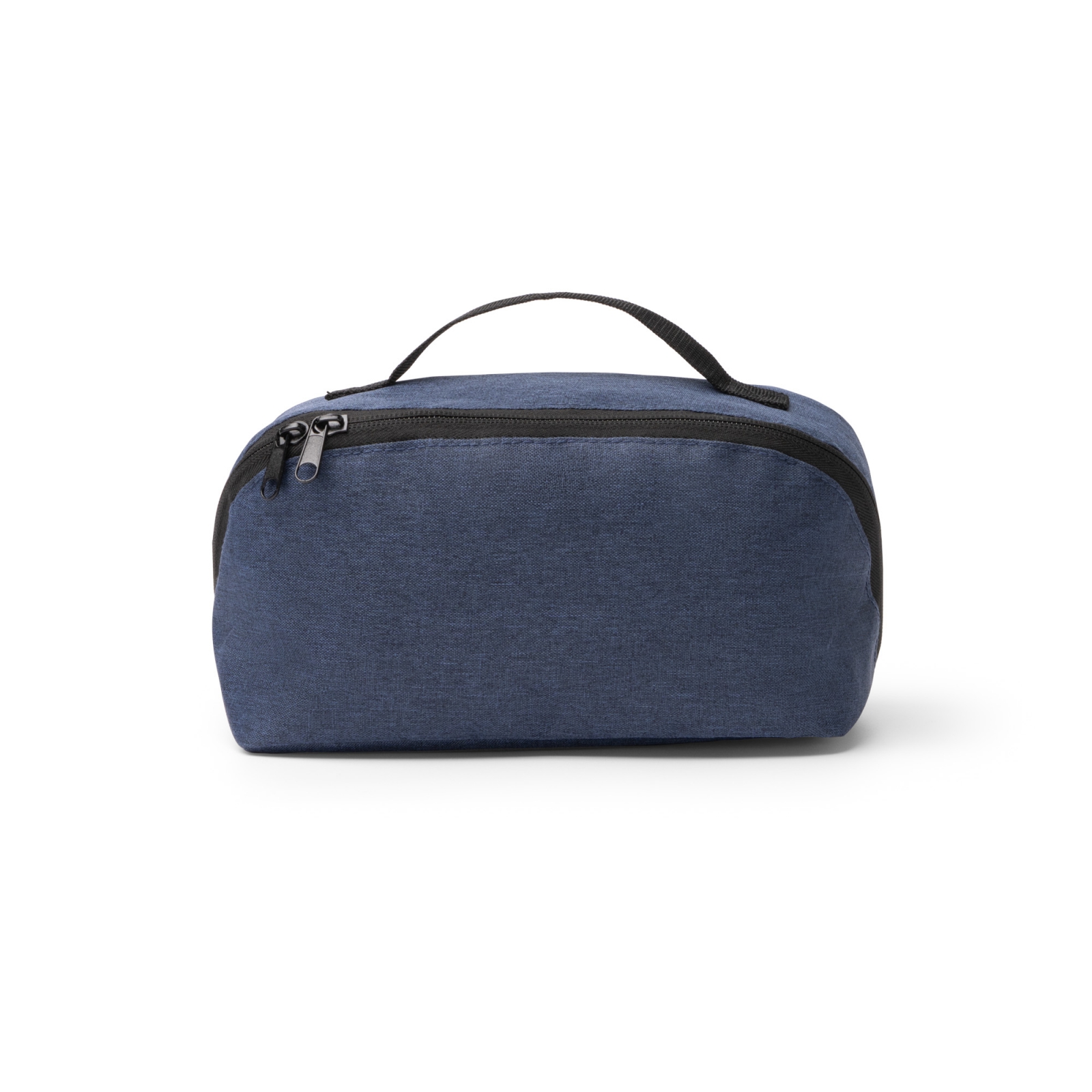 neceser elaborado en rpet 600d con cierre de cremallera en diagonal. su compartimento principal es de gran amplitud abiendo 180º con un bolsillo independiente con cierre de cremallera que sirve a modo de separador, además de un bolsillo adicional en tejido de rejilla con ajuste elástico. incorpora asa de transporte.