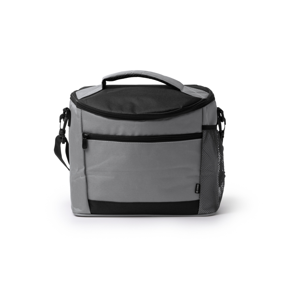 nevera de gran formato realizada en 600d rpet. bolsillo frontal y lateral con cierre de cremallera. interior isotérmico. cinta de transporte ajustable. capacidad de 8l.