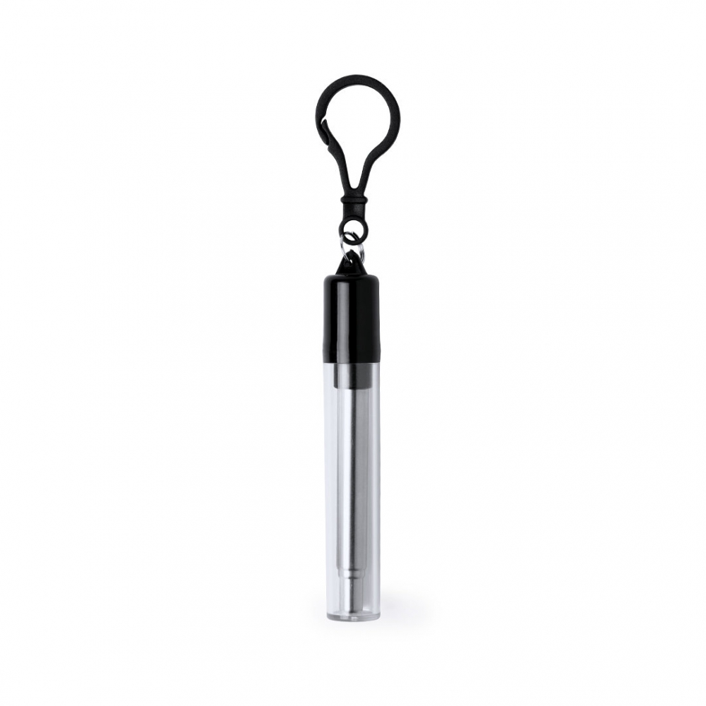 pajita reutilizable y extensible en acero inoxidable, con boquilla de silicona. con accesorio limpiador incluido y presentada en estuche transparente con accesorio para transporte.