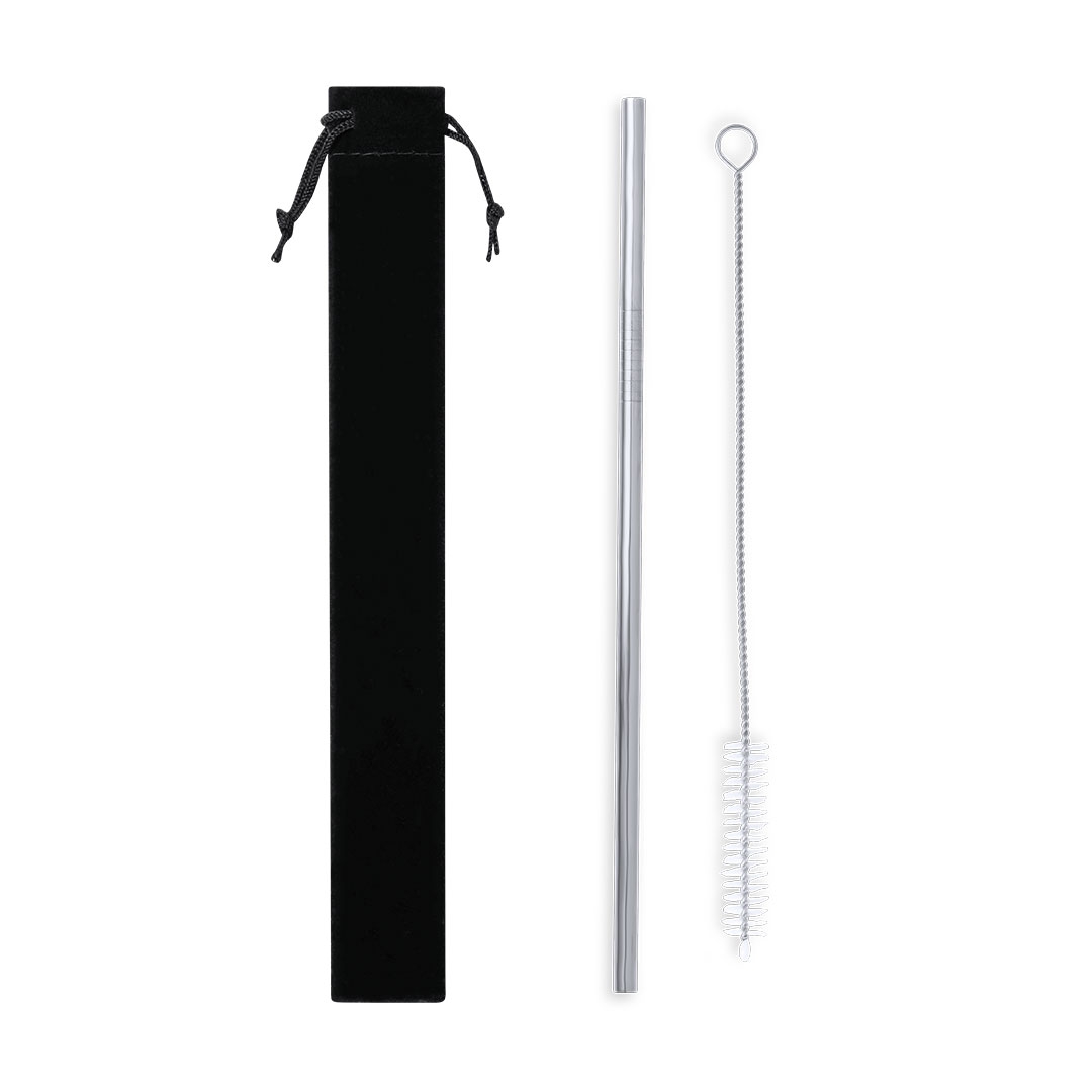 juego de pajita reutilizable en acero inox. con accesorio cepillo limpiador incluido y presentada en estuche de suave microfibra con cordones ajustables para mejor cierre.