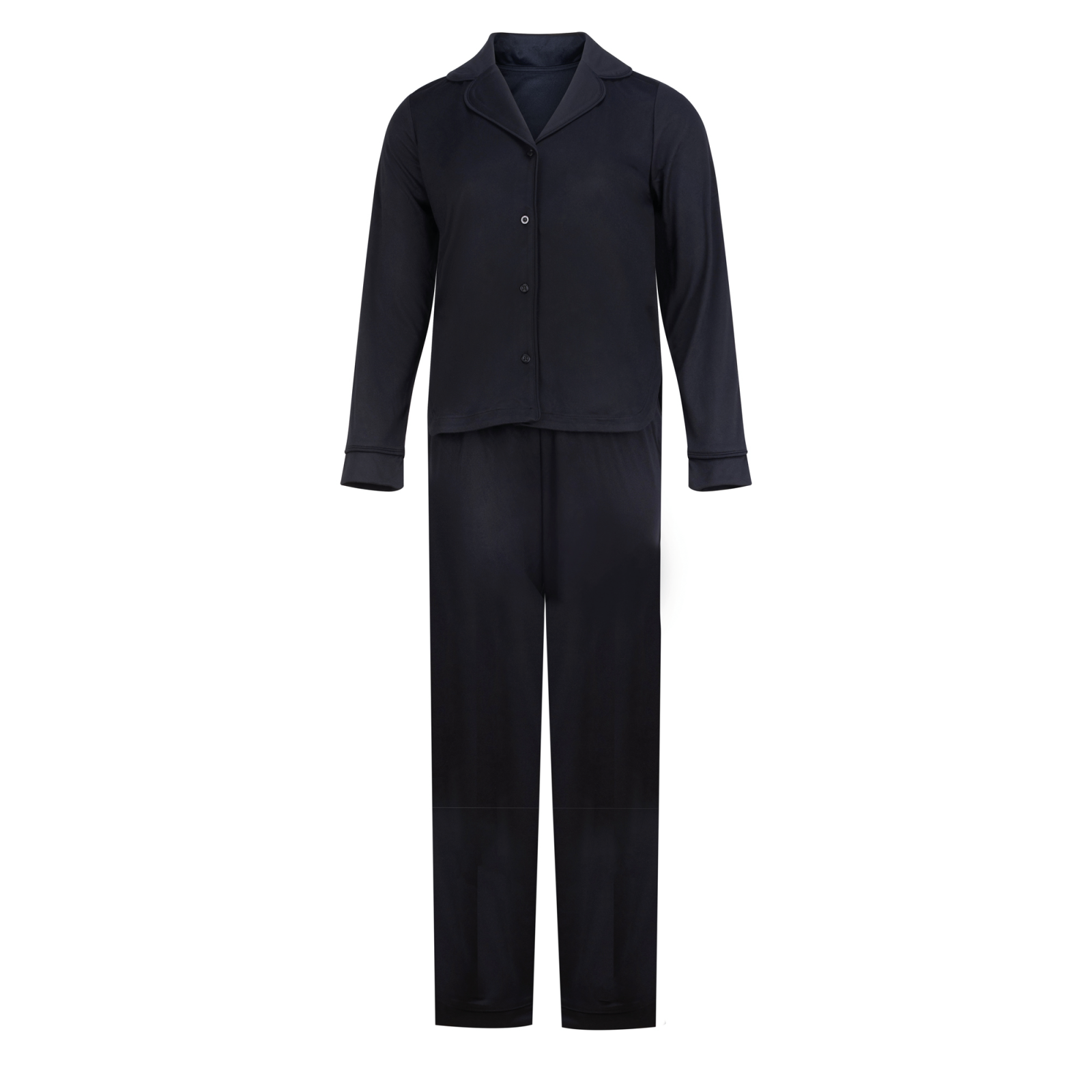 100 % poliéster reciclado. camisa de manga larga con pantalón a juego. cuello con solapa abotonada y botones de nácar dtm. cintura elástica con cordón de ajuste funcional. ribete en contraste en el cuello, la parte delantera, las mangas y el bajo. pie de botonadura caído y tira cubrecosturas en la espalda. confección con poliéster reciclado.conjunto pijama.