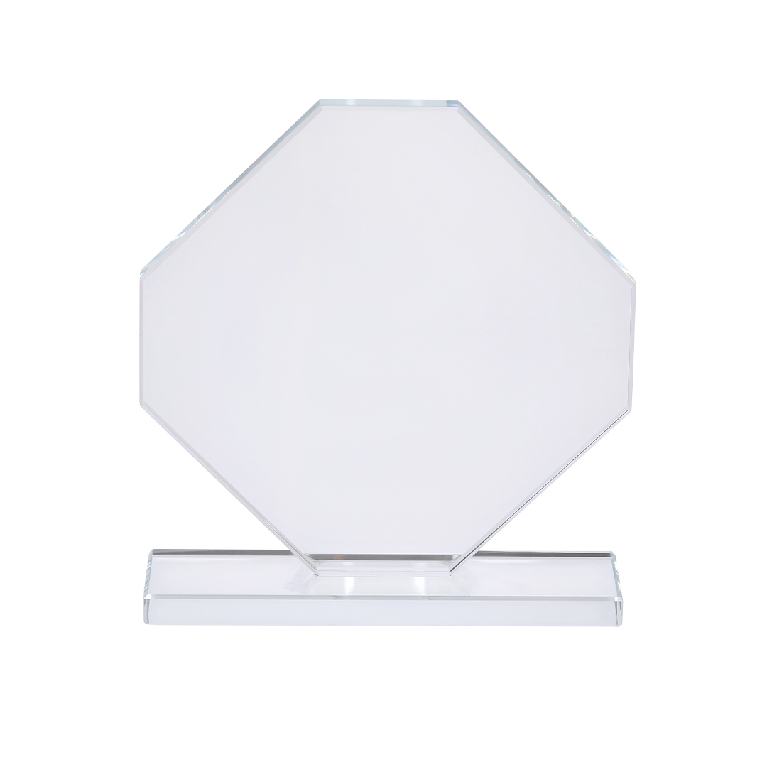 placa trofeo de grueso cristal con elegante diseño octogonal con soporte. ideal para regalos personalizados, reconocimientos, premios y decoración.presentada en estuche de protección individual en elegante diseño.