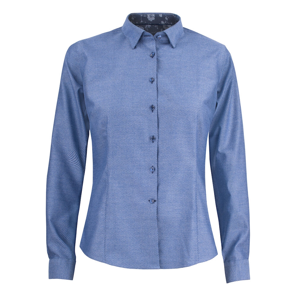 camisa con botón oculto en cuello. detalles en azul en cuello y botones.